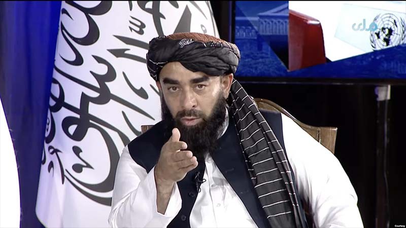 Taliban spokesperson Zabihullah Mujahid speaking on state-run Afghan broadcaster. (VOA screen shot)