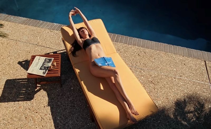 Johnson relaxing at a poolside wearing only a Calvin Klein bra. Photo: Screen-grab/YouTube